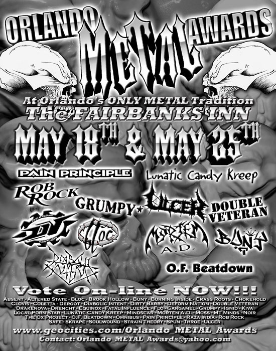 The Orlando METAL Awards began as a hair-brained conversation between two friends about what could be done to give the Orlando METAL scene a kick in the pants. Loosely based on the original "Tampa Bay Metal Awards" (during the 90's), and another attempted awards show called the "Central Florida Music Awards". The idea was to create something that the fans had never experienced before, attempt to break through the "Band Politics", and overcome the "cliques" that seemingly existed at the time. After all, METAL bands in Orlando had only two places, so the concept of bringing all forms of METAL together during one show in support of one another was ultimately the initial goal.